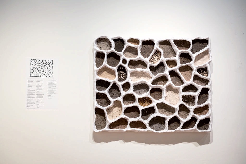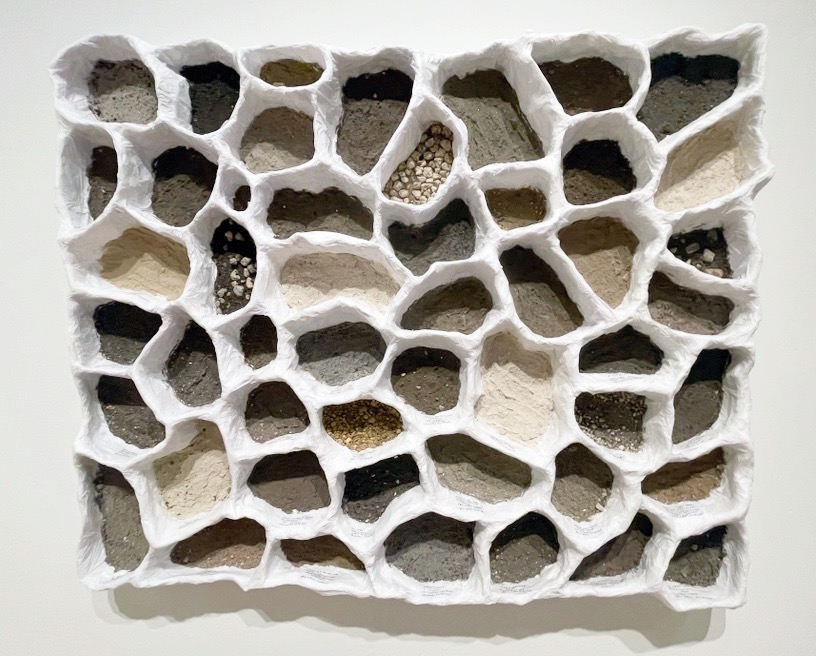 60”x48”x5” (Plaster, paper mâché clay, tissue paper, soil samples from 50 locations) 2025